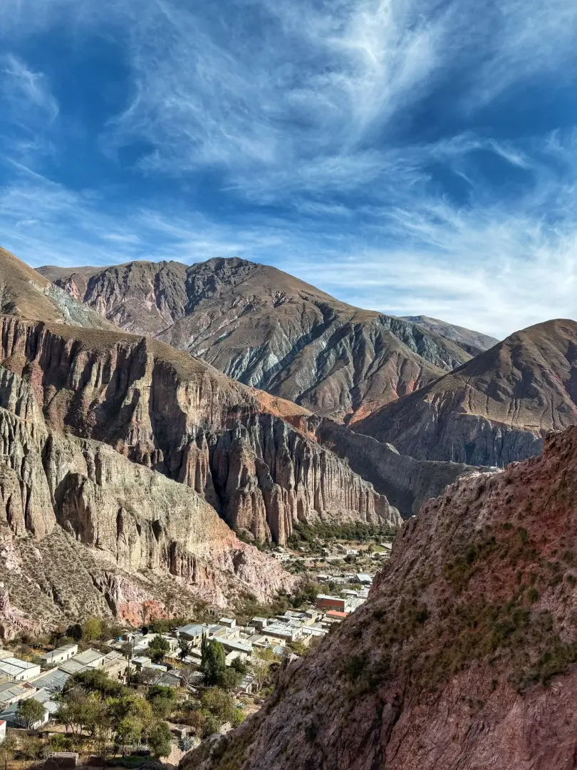 Desde cualquier punto del pueblo podrás contemplar los estratos geológicos multicolores de las montañas circundantes y el río Iruya serpenteando por el valle.