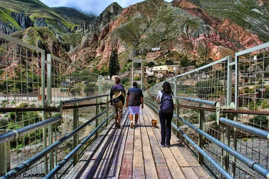Desde el puente se despliega una perspectiva única del Valle de Iruya, con los cerros multicolores estratificados que parecen pintados a mano, el lecho pedregoso del río y la vegetación andina que serpentea por las riberas.